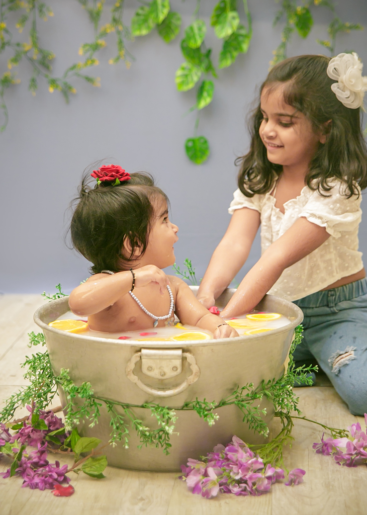 A soothing photo session where babies sit in a warm tub of milk with flowers or fruits, creating dreamy, timeless portraits.